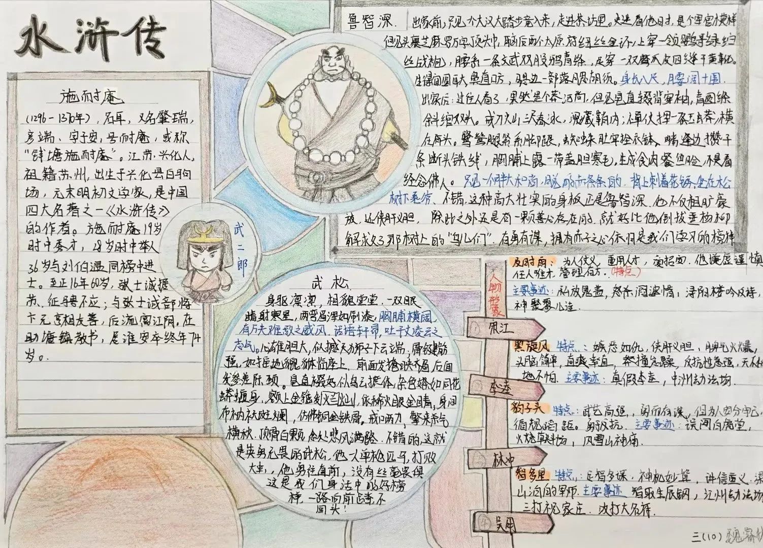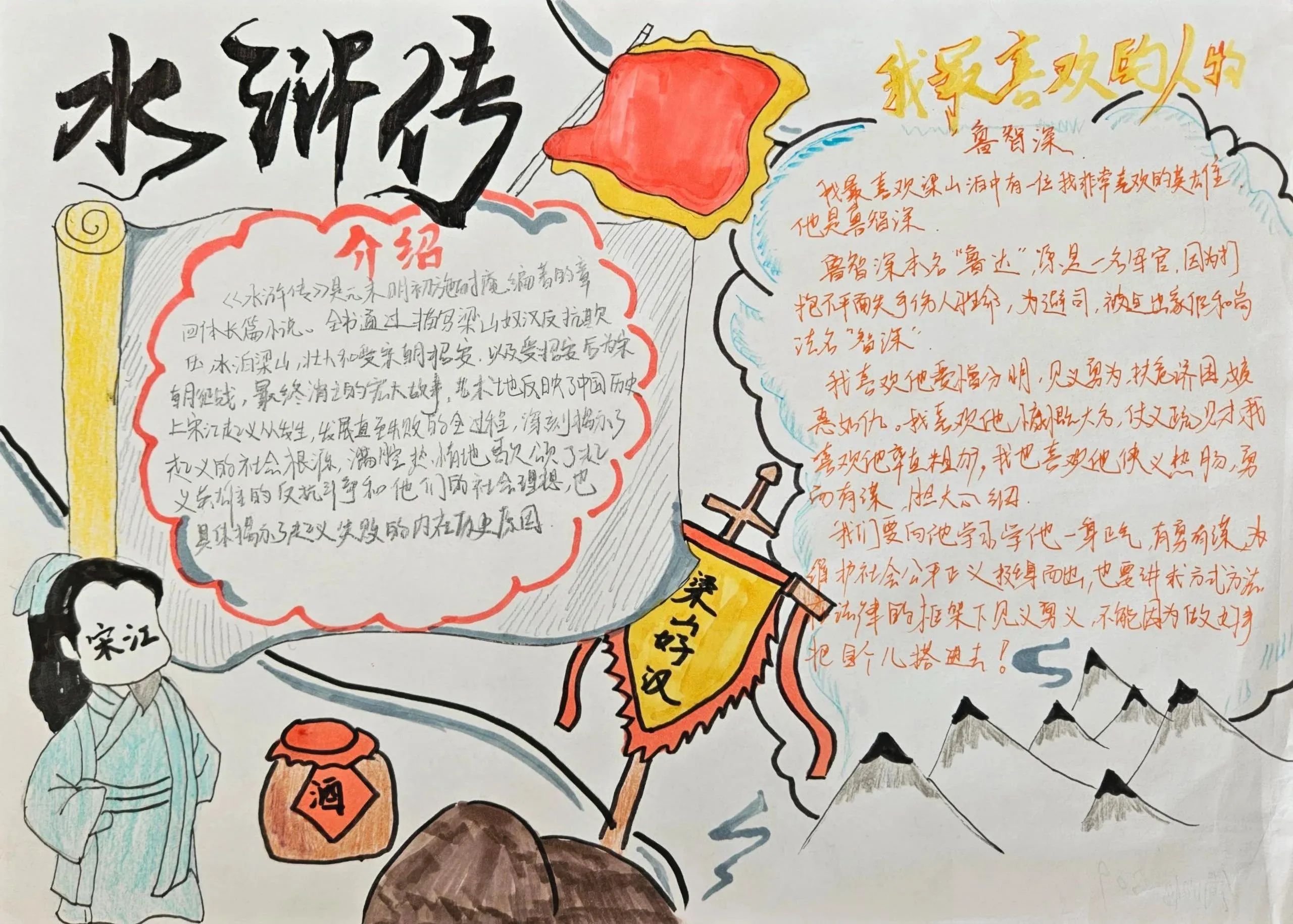 水浒小报: 读书的乐趣不仅仅在深邃的文字中,一幅幅有趣的手抄报展现对名著的理解。在提高学生对文学作品的理解的同时,培养他们的写作能力。