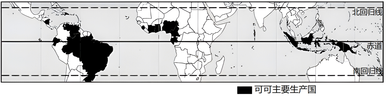 27.可可是一种喜温喜湿的农作物,下图为世界可可主要生产国分布图,读图,可可生长地区的气候类型主要是( )