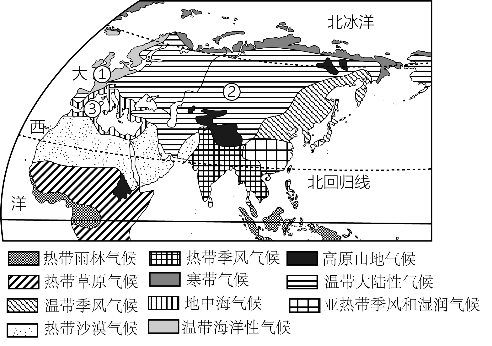 (1)小芳发现地处亚欧大陆中纬度地区的①、②、③三地气候变化有以下规律:由①到②到③,气温年较差逐渐加大,而年降水量却呈现出递减趋势。你认为造成这种现象的原因主要是受( )因素的影响