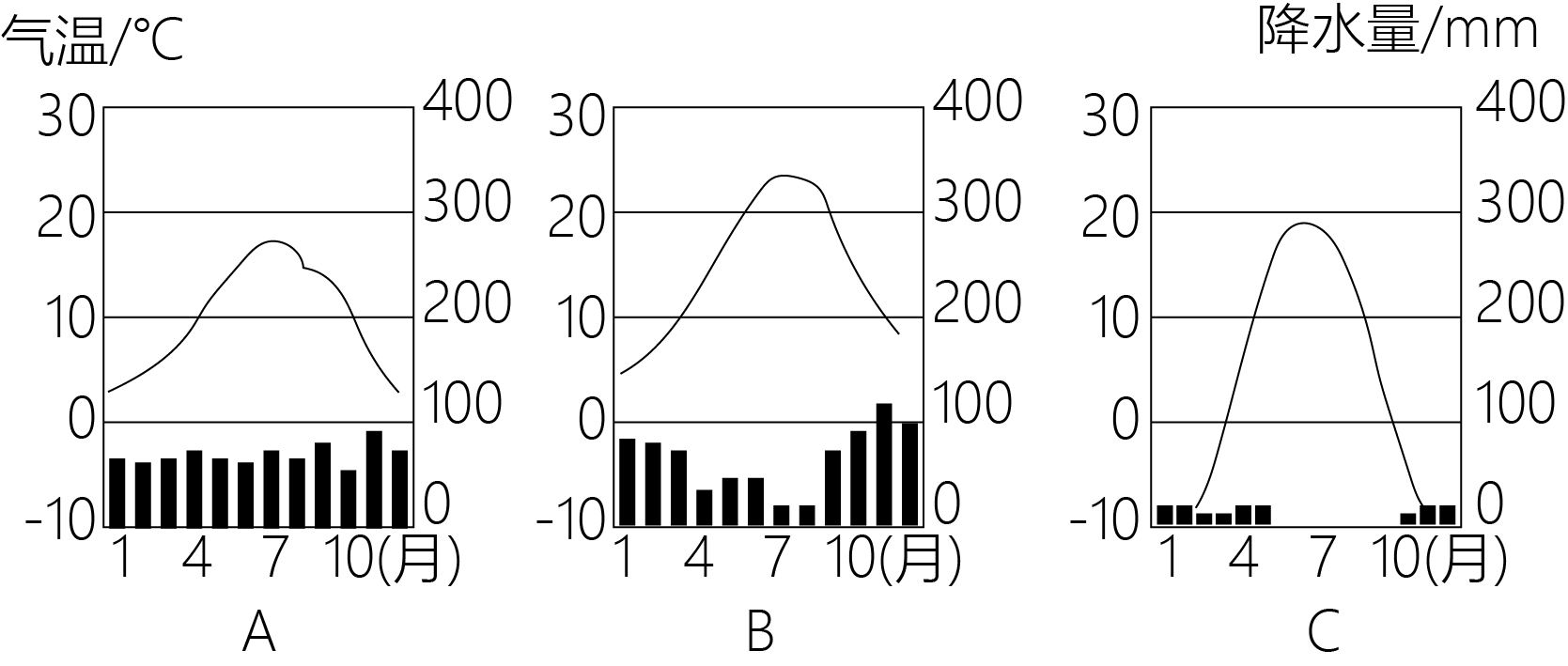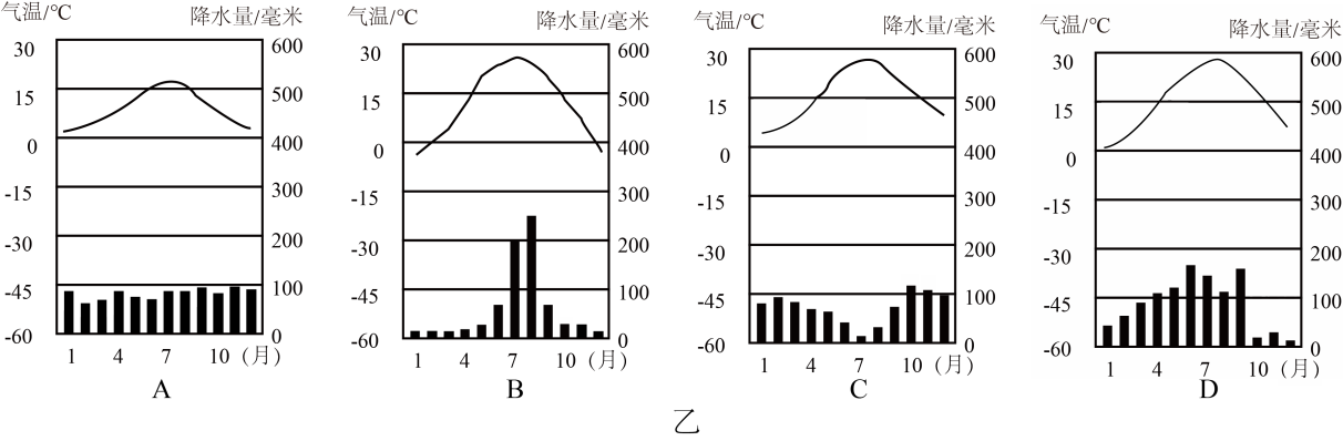 (3)小明需要了解北京的气温和降水情况,你认为乙图中的____图(填字母)能帮助小明解决这一问题。请你从气温和降水两方面补充北京的气候特点。气候特点:冬季寒冷干燥,夏季____。