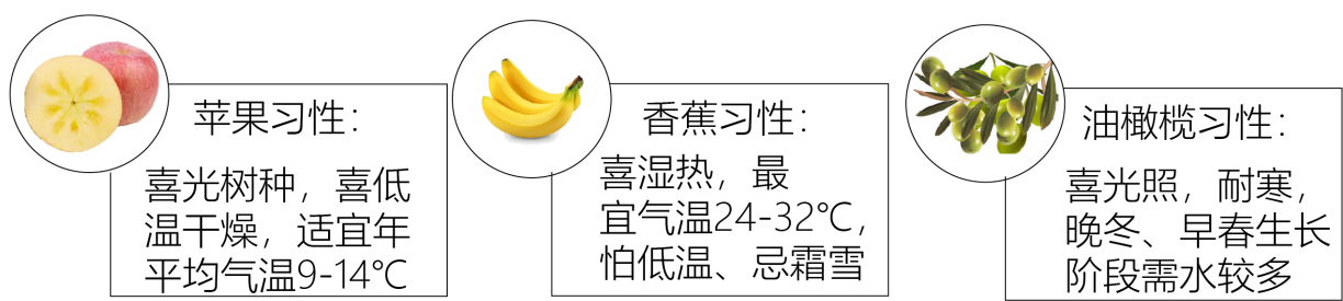 (3)右图字母B是 气候,根据水果的生长习性,该气候区盛产 (从下图中选择)。