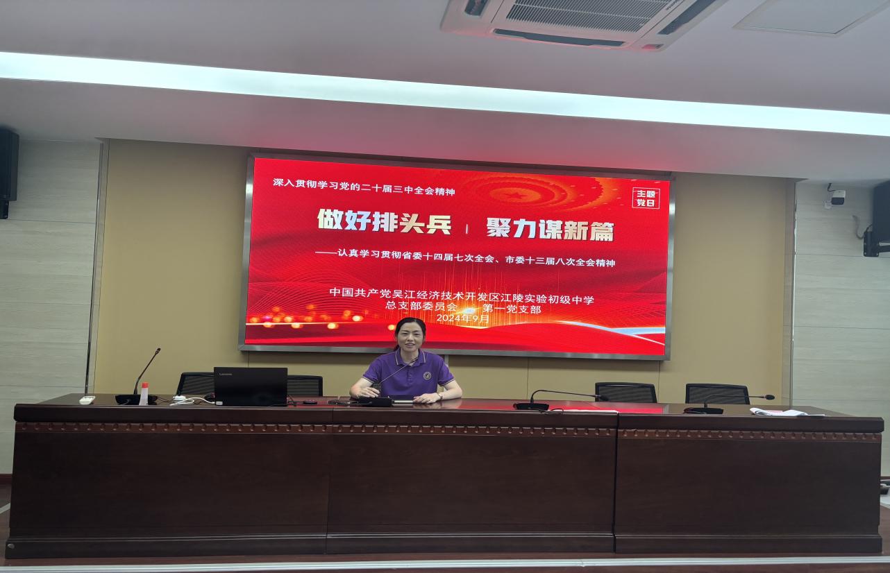 9月18日,吴江经济技术开发区江陵实验初级中学第一党支部召开“做好排头兵 聚力谋新篇——认真学习贯彻省委十四届七次全会、市委十三届八次全会精神”主题党日活动,支部全体在职党员参加了本次会议。